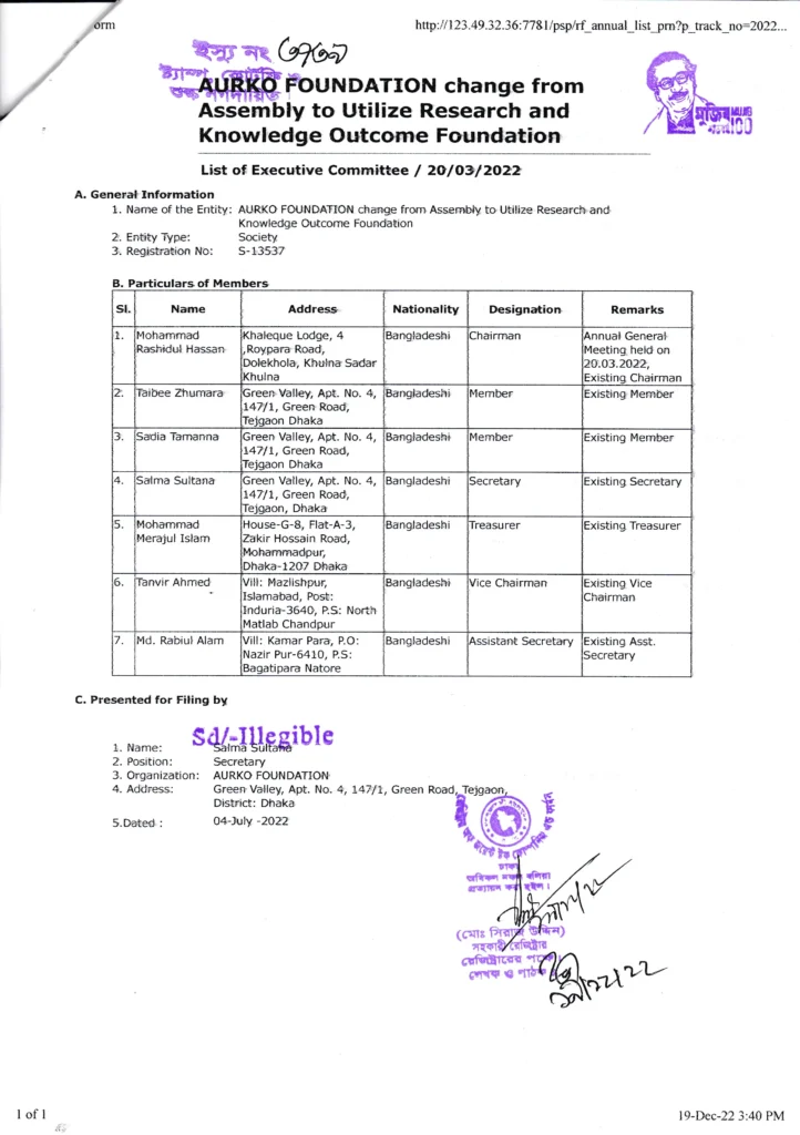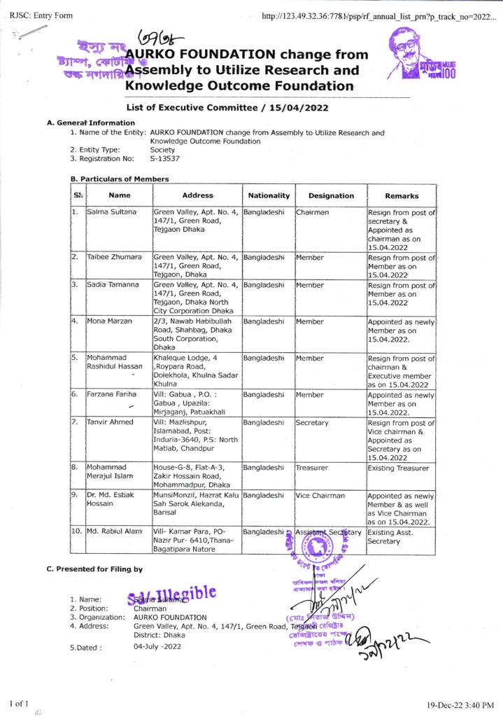 RJSC registration confirms AURKO Foundation as a legally registered Society in Bangladesh with an officially filed governance structure.